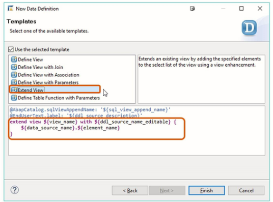 There is a dedicated template for creating the definition of a view extension. After creating the DDL source, you must specify the name of the CDS view you want to extend, the name of the new CDS entity, and the name of the SQL view append.