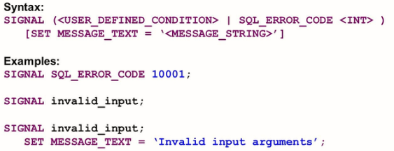 The first example assigns a custom error code to the value of: SQL_ERROR_CODE. In the second example, the execution is declared to be in the state of invalid_input, which would have been set by a DECLARE CONDITION statement; the value of: SQL_ERROR_CODE whatever value was set in the CONDITION.