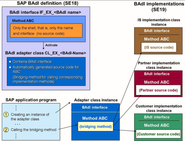 A BAdi definition and an interface are created using SE18. The creation of the BAdi and interface results in the automatic generation BAdi adapter class and a corresponding bridging method, which the SAP application call to branch to the relevant code. The only task of this bridging method is to call the existing active implementations of industry solutions, partners, and customers, one after the other. The sequence in which they will be called cannot be guaranteed.