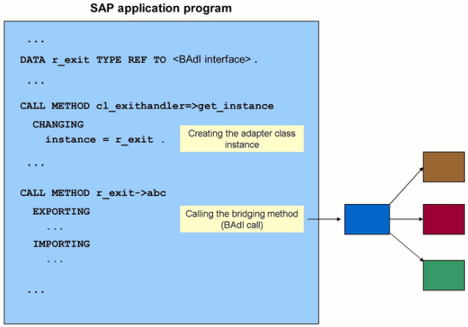 When the GET_INSTANCE static method of the standard class CL_EXITHANDLER is called, an instance of the adapter class is created. The bridging method is then called through the BAdi instance, and it branches to the relevant implementations.