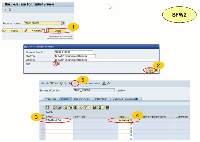 The customer defines a switch, to which he or she assigns the package with the implementations to be activated. The customer also defines a business function to which they assign the switch. This task can be done using transaction SFW1 and SFW2.