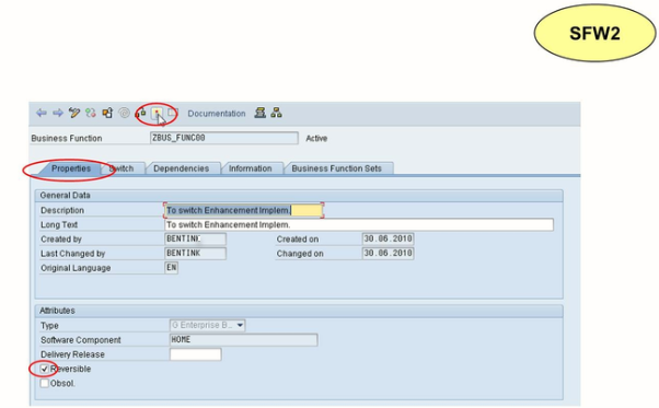 To enable the business function to be deactivated, select the reversible checkbox on the Properties tab page. All business functions can be switched on; however, one reversible business functions can be switched off later.