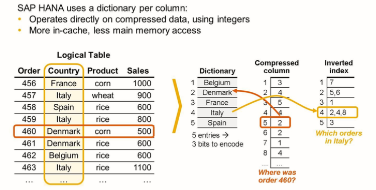 SAP HANA uses different, efficient compression methods, such as dictionary encoding, run-length encoding, and more. This has the following benefits: -