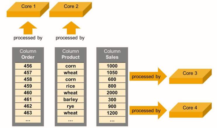 On SAP HANA and with column storage, data is only partially blocked. This makes parallel processing possible. Even the same column can be split up and processed by different cores at the same time