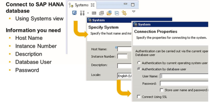 To connect to a SAP HANA system and see the corresponding catalog and content, use the Systems view, and the context menu item Add System.