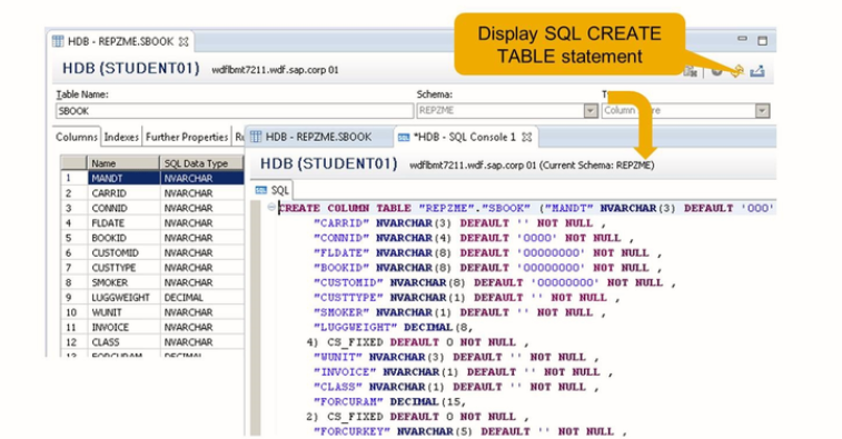 Once connected, you can open the database catalog and look at the definition of tables on the SAP HANA layer. The table editor also allows the export of the SQL statement used to create the database table.