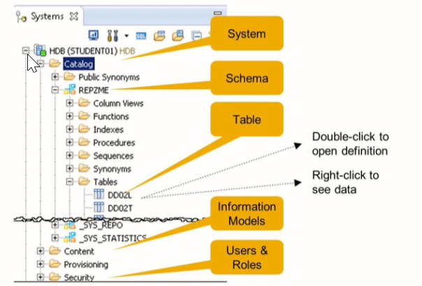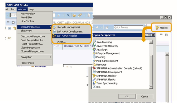 Like most eclipse-based developments environments, SAP HANA studio provides several perspectives within the eclipse workbench. Each perspective is tailored for particular groups of tasks and is a pre-configured set of panes called views, such as:-