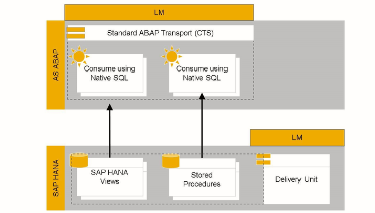 Starting with ABAP 7.40 SP02, ABAP provides new repository objects to simply the bottom-up approach. These new objects are created in the ABAP repository as representatives or Proxy objects for the objects created on SAP HANA. Access to the proxy objects does not require the use of native SQL.
