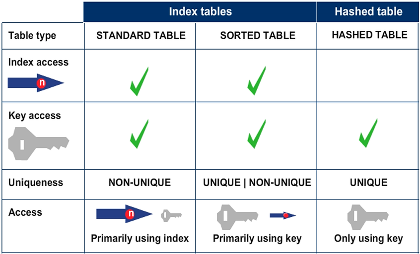 Like standard tables, sorted tables are managed using a table index. The entries are always sorted in ascending order by the table key. As a result, the system automatically performs a binary search during table key accesses.
