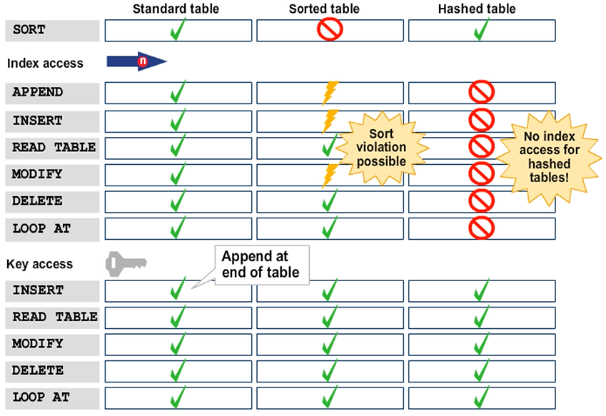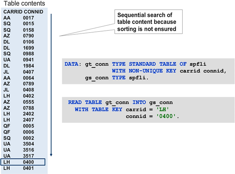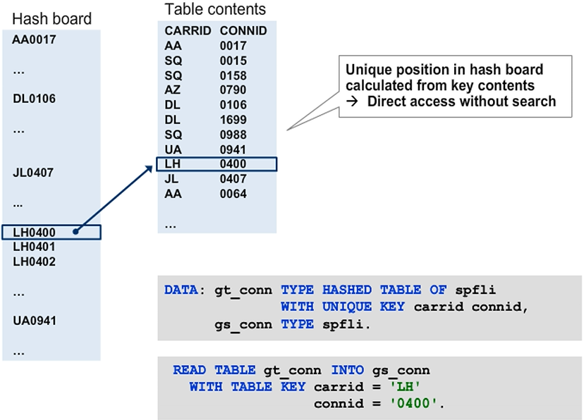 Hint: Loops (LOOP ... ENDLOOP) ignore the hash board and search the table contents directly. The content is unsorted, but for this purpose, it can be sorted by using the SORTstatement.