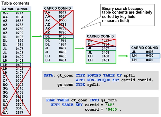Note: If the internal table is explicitly sorted by using the SORT statement, the BINARY SEARCH addition can significantly speed up access.