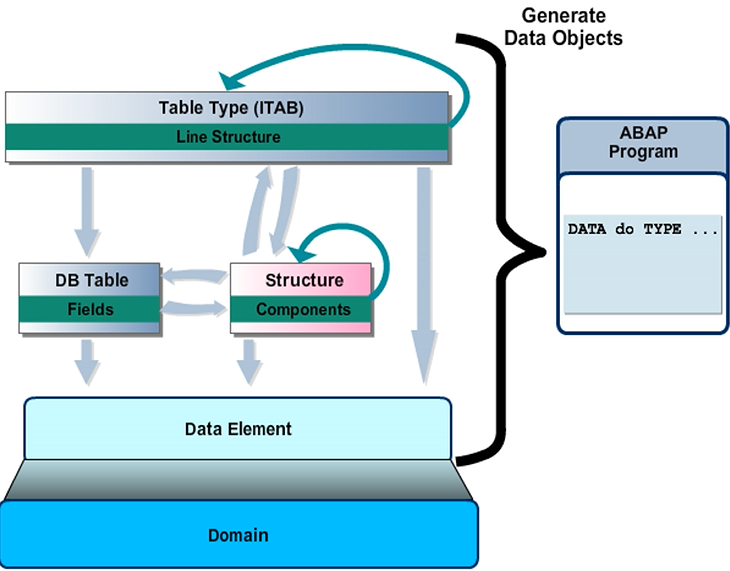 You can use the type definitions shown in the figure, (with the exception of the domain) to define data objects in ABAP programs. The arrows show how the type definitions can be used together.