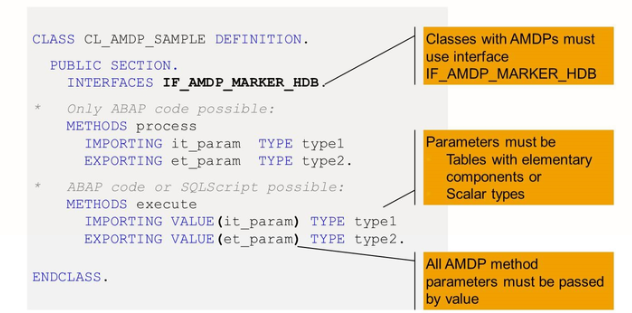 Classes that are to act as a container for AMDPs have to implement a so-called Marker interface IF_AMDP_MARKER_HDB.