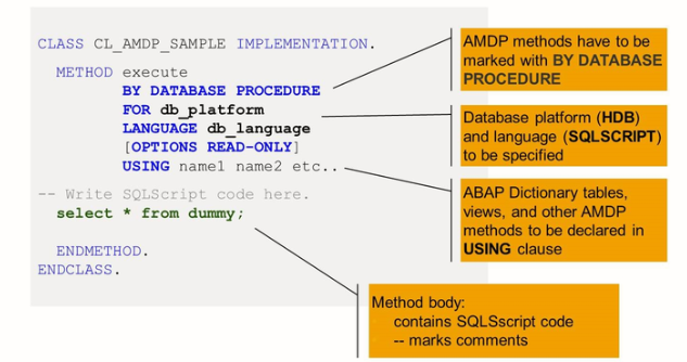 AMDP methods are identified with the syntax BY DATABASE PROCEDURE. The database system(for example, HDB) and language(for example, SQL Script) must also be specified. Optionally, the AMDP method can be marked as a READ-ONLY database procedure. It is also necessary to list all ABAP Dictionary tables, views, and other procedures used in the procedure body in the USING clause. The method body can then be implemented using native SQL Script source code. Almost the full SQL Script reference can be used in the method body, except the CE function CE_COLUMN_TABLE.