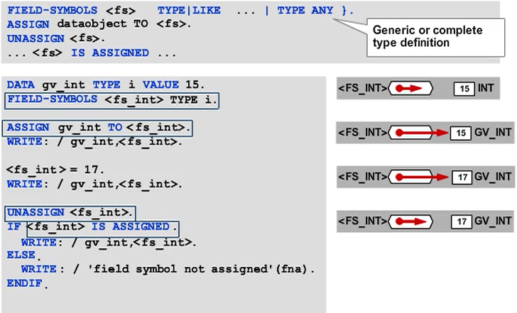 You declare field symbols using the FIELD-SYMBOLS statement. Note that the angle brackets (<>) in the field symbol name are part of the syntax. Use the ASSIGN statement to assign a data object to the field symbol.