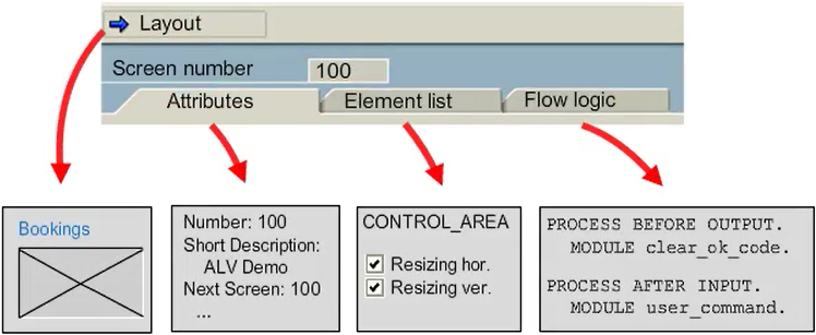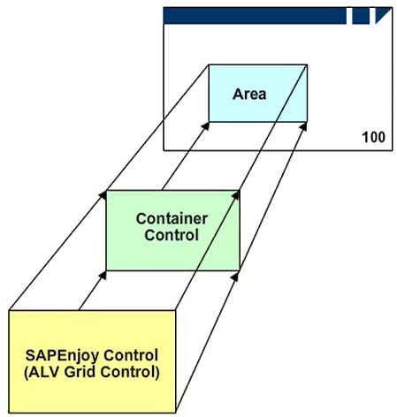 Graphically, the connection of a GUI control to a screen is a chain of objects. An area is reserved on the screen to display a control. A container control is placed in this area. The ALV Grid is then linked to the container and is displayed in the reserved screen area.