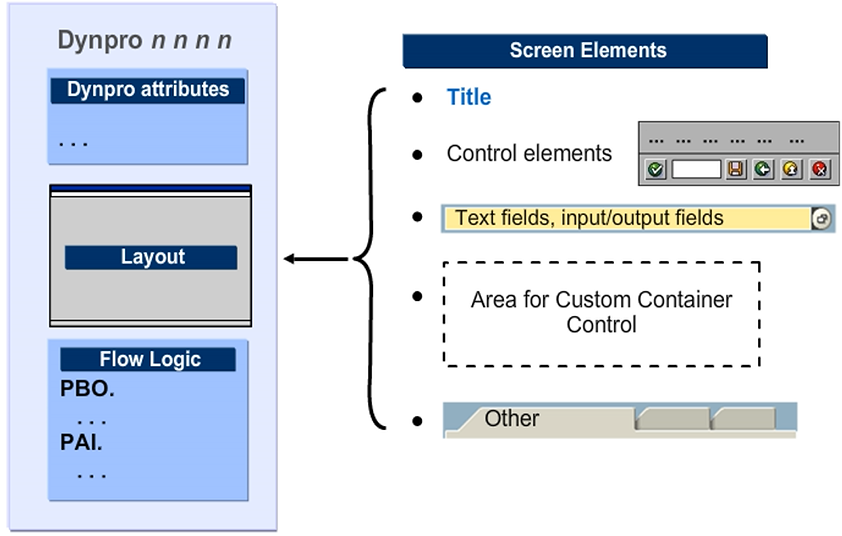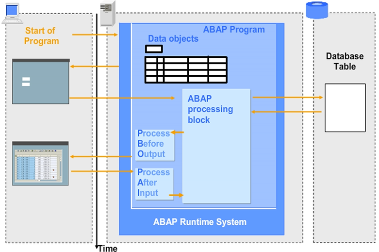 The application program communicates with the screen at runtime using various services of the runtime system (ABAP processor and dynpro processor). This communication also uses services in the SAP GUI, such as managing the windows and their pop-up levels, data transfer, and so on.