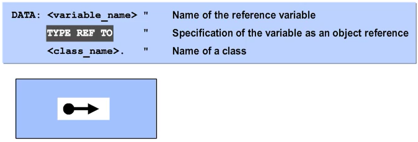 To declare the reference variable in your program, use the DATA statement and assign a name to your reference variable. The TYPE REF TO addition means that the field can contain a pointer to an instance. Specify the name of a class after TYPE REF TO. The reference variable can then contain pointers to instances of this class.