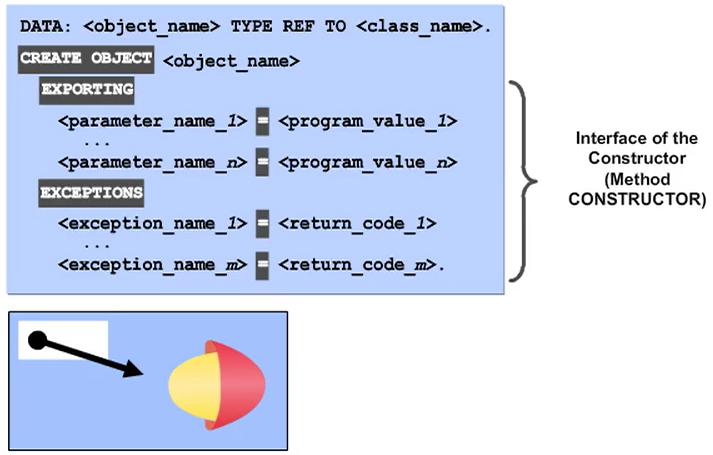 If the class for which you want to generate an instance has a method with the name CONSTRUCTOR, it is automatically executed when the instance is created. The CONSTRUCTOR method can only have IMPORTING parameters and exceptions (EXCEPTIONS) as a signature. You must pass these parameters in the CREATE OBJECT statement, taking care to assign values to all obligatory IMPORTING parameters.