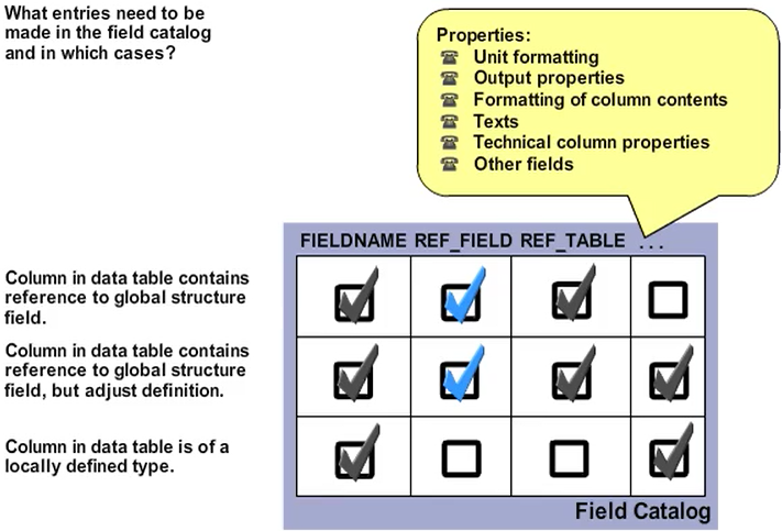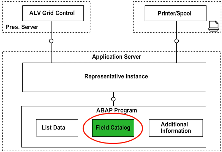 The internal table contains the data to be displayed. This table can have a freely definable row type so that the representative instance can display the data transferred to it as desired on the screen output or when creating a print list. To perform this action, the representative instance requires information about the type and formatting of each column. This is the job of the field catalog.