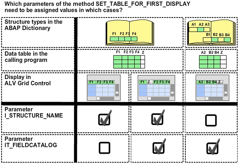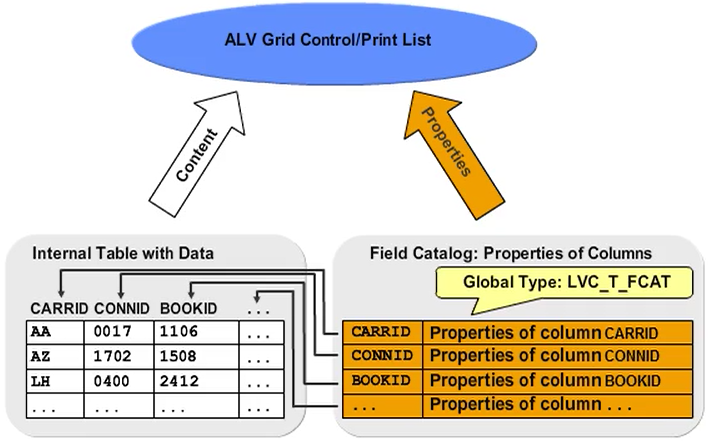 You can also pass this display information to the representative instance using an additional internal table. This additional table is called the field catalog. The global data type of this internal table is LVC_T_FCAT. The corresponding structure type (for the work area) is called LVC_S_FCAT.