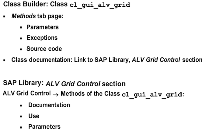 By accessing the Class Builder, the Class cl_gui_alv_grid can be displayed. In the Methods tab any of the methods of this class can be selected. Using the buttons on this page, the parameters, exceptions, or source code of the selected method can be viewed. The class documentation can be found in the Application Toolbar. The class documentation contains a link to SAP Library.