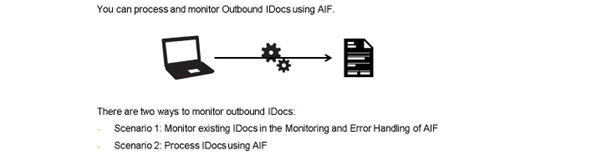 With the IDoc scenario 1 you can monitor existing IDocs in the Monitoring and Error Handling transaction. The processing of the IDocs is not influenced by AIF. The scenario uses only the monitoring capabilities of the Monitoring and Error Handling.