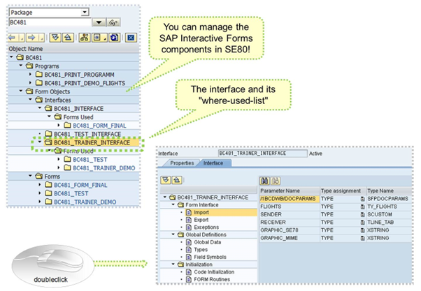 In SE80 navigation, using the package BC481 leads directly to the relevant interfaces, forms, and printing programs of the BC481 class.
