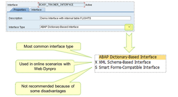 The type “ABAP-Dictionary-Based Interface” is the most common Interface type and is used for print/interactive scenarios.