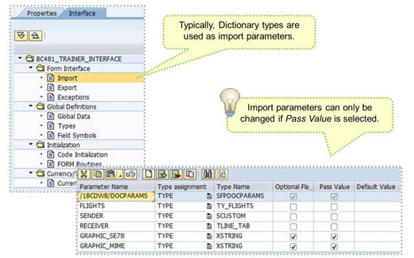 The import parameters defined in the interface can be passed from the application program to the form at runtime, and vice versa for export parameters.