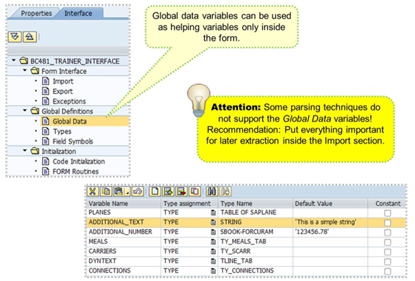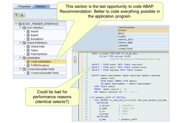 In the Initialization section, you can initialize global data before you start to process the form, for example, to convert selected application data. You can also select additional data without having to make changes in the application program. Always keep performance issues in mind when coding in the form interface.