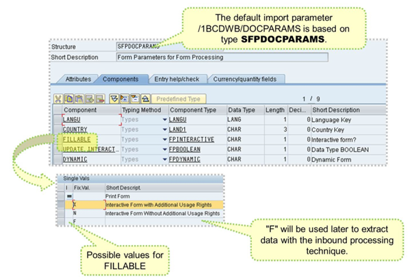 The default import parameter /1BCDWB/DOCPARAMS is used to determine form's locale (language and country) and whether the form allows interactive functions.