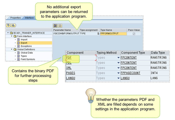 In the EXPORT section, there is just one default parameter of type FPFORMOUTPUT.