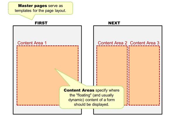 Content areas are shown in red in the figure above. Content areas define the space where flowing content appears on the master page. A master page can have multiple content areas. As an example, think of a newspaper with multiple narrow columns per page.