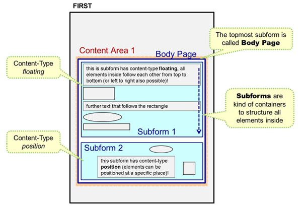 Pages (design view)–or, rarely, master pages–can contain subforms. The blue area in the figure is a subform called Body Page. It contains more subforms.