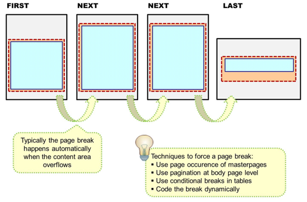 Dynamic content is wrapped up in pages on the design view (not shown). A page (design view) will use the space provided by a content area. If, at runtime, this content area is not sufficient due to a large amount of data, the body page will look for the next content area (which might involve an automatic page break).