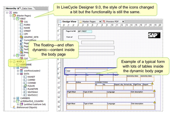 The example here shows the top-most subform BODY_1 (they always should be named “...body...”). BODY_1 contains several fields such as USERNAME, FLIGHTS, and CARRIERS. USERNAME is an elementary field. FLIGHTS is a more complex field; it is an array or–in ABAP wording–an internal table. The data for these fields was passed via the application program.