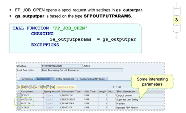 In the application that calls a form template, you can use the function module FP_JOB_OPEN to make settings for the form output and spool control with Adobe Document Services (ADS). You control the output by using the parameters (IE_OUTPUTPARAMS) of the structure SFPOUTPUTPARAMS.