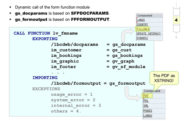 The name of the function module generated for the form must be determined, as the name differs depending on the form and system.
