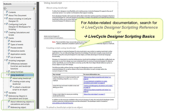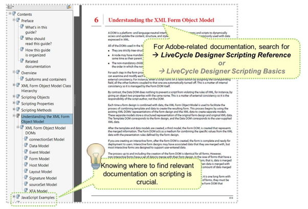 Again, you can use the LCD built-in documentation on these topics, but even more powerful is the documentation found on the Adobe sites. Search for LiveCycle Designer XFA, LiveCycle Designer scripting reference, LCD scripting basics, or LCD XFA model, for example.