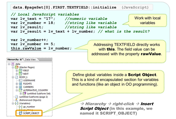Keep in mind that scripting is optional and reduces the form's processing performance. If possible, all necessary coding (for example, to initialize values in forms) should happen in the print program (which is officially called the application program).