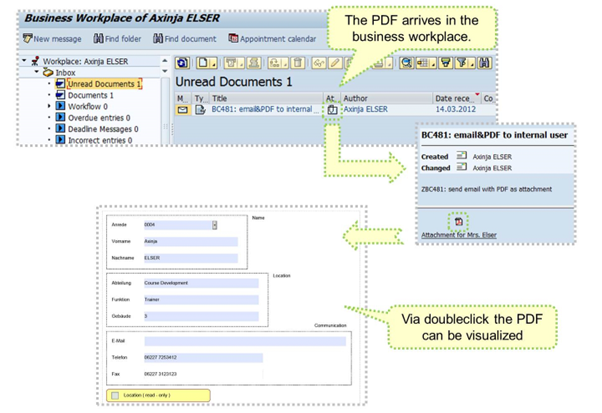 The recipient can access his or her business workplace (transaction SBWP) with the incoming mails and PDF attachments.