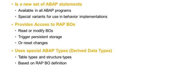 The ABAP EML is a subset of ABAP for accessing RAP business objects (RAP BOs). EML statements allow the data content of a RAP BO (transactional buffer) to be read or modified and the persistent storage of modified data to be triggered.