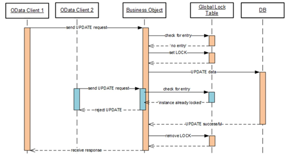 The example illustrates how the lock is set on the global lock table during an UPDATE operation. The client that first sends a change request makes an entry in the global lock table. During the time of the transaction, the second client cannot set a lock for the same entity instance in the global lock tables and the change request is rejected. After the successful update of client 1, the lock is removed and the same entity instance can be locked by any user.