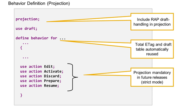 RAP draft handling can be reused with the syntax element use draft. As a prerequisite, the underlying RAP BO must be draft-enabled. The draft tables and the total ETag field are implementation details that are automatically reused and do not have to be explicitly specified.