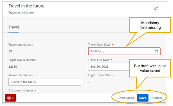 When you edit data in a draft enabled SAP Fiori elements application, the framework will save the user entries in a draft instance - even if the data is inconsistent or incomplete.