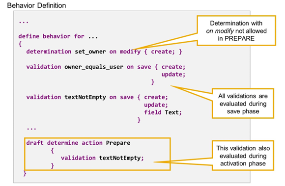 Like all other draft actions, PREPARE is implicitly enabled as soon as the business object is draft enabled, but, in this case, no determinations and validations are assigned to it. The assignment of determinations and validations must be done explicitly in the behavior definition. To assign validations and determinations, add a pair of curly brackets after the action name and list the validations and determinations there.