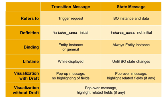 RAP distinguishes Transition Messages and State Messages. While transition messages refer to a triggered request, state messages refer to a business object instance and its values.