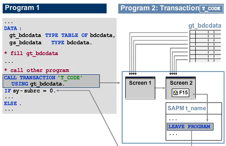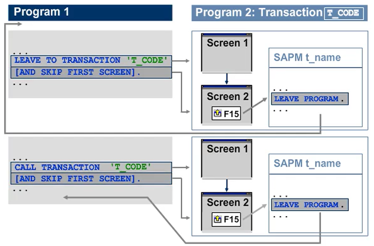 If you use the LEAVE TO TRANSACTION 'T_CODE' statement, the system terminates the current program and starts the transaction with transaction code T_CODE. This statement is the equivalent of entering /NT_CODE in the command field.