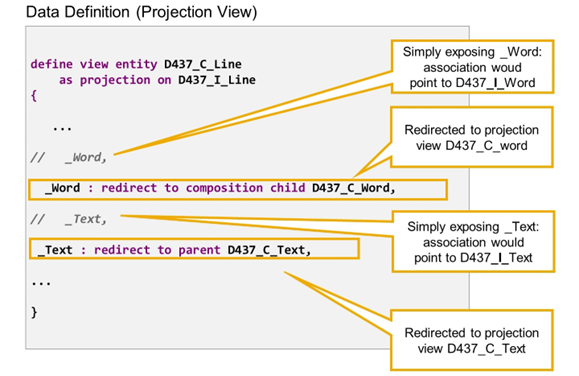 For redirecting compositions and to-parent associations, ABAP CDS offers the dedicated syntax elements redirected to composition child and redirected to parent. By using these variants, the special characteristics of compositions and to-parent associations are kept.